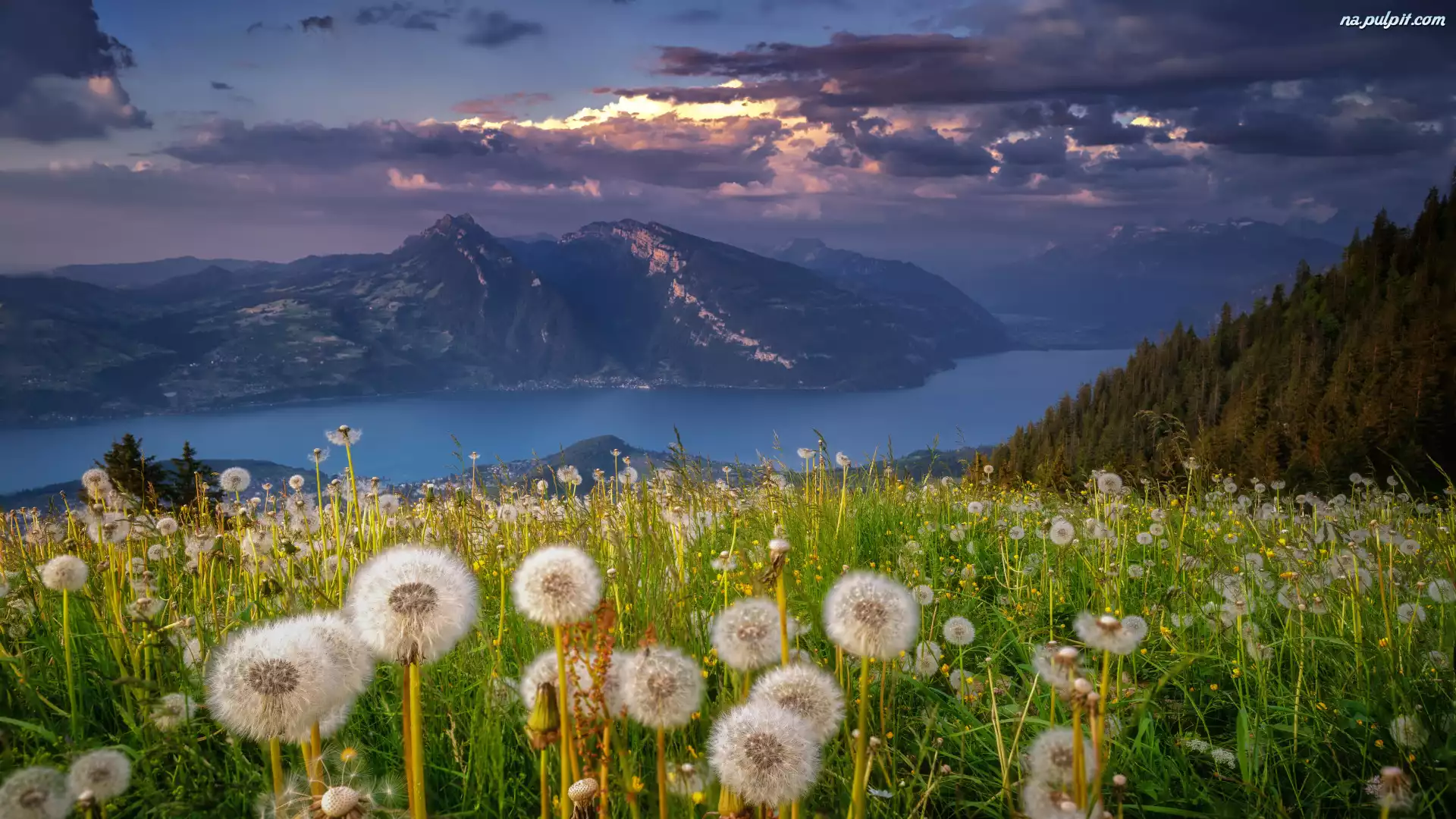 Drzewa, Łąka, Chmury, Jezioro, Mniszek lekarski, Polana, Góry, Kwiaty, Dmuchawce, Las Na Pulpit