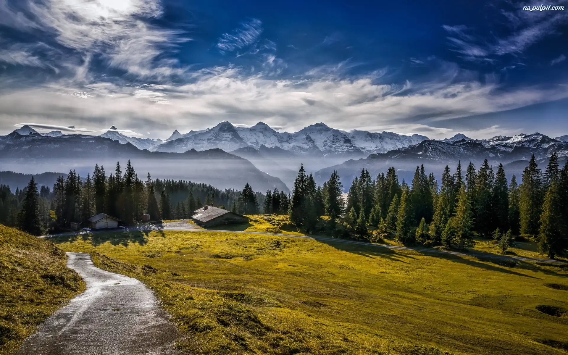 Polana, Droga, Las, Drzewa, Góry, Domy Na Pulpit