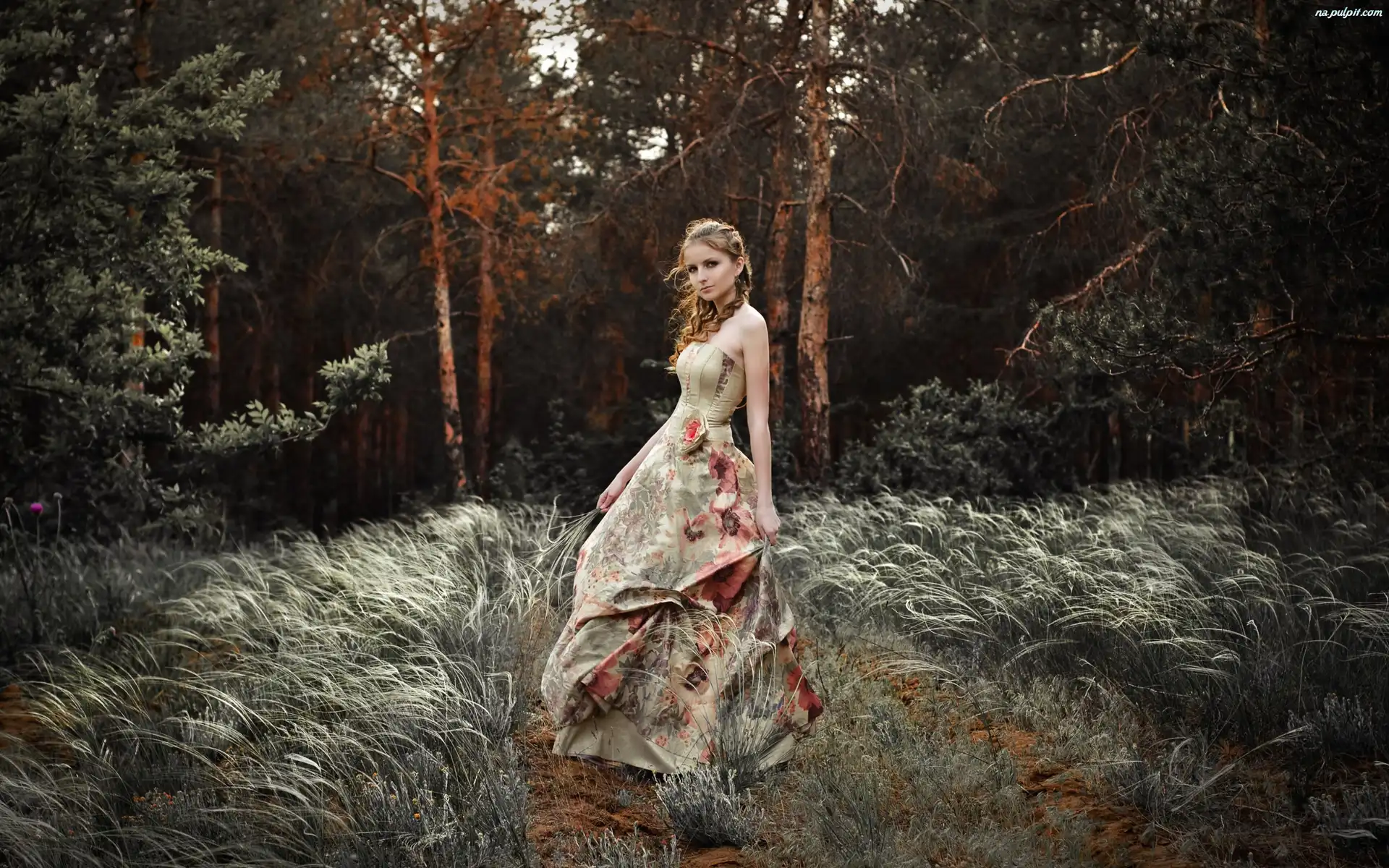 Sukienka, Polana, Długa, Trawa, Sucha, Las, Kobieta Na Pulpit