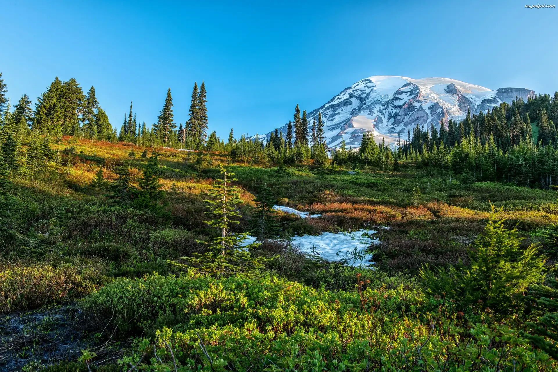 Polana, Stan Waszyngton, Park Narodowy Mount Rainier, Stratowulkan Mount Rainier, Łąka, Śnieg, Góry, Stany Zjednoczone, Drzewa Na Pulpit |