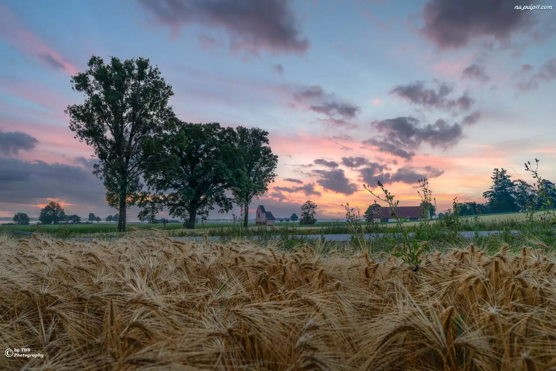 Chmury, Kapliczka, Drzewa, Pole, Zboże, Droga, Dom