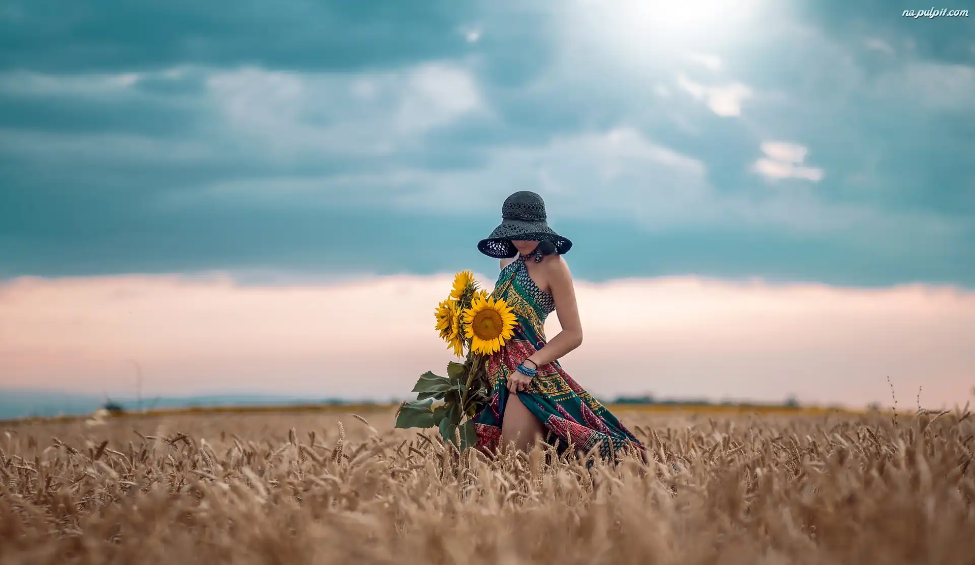 Pole, Kapelusz, Słoneczniki, Kobieta, Zboże Na Pulpit