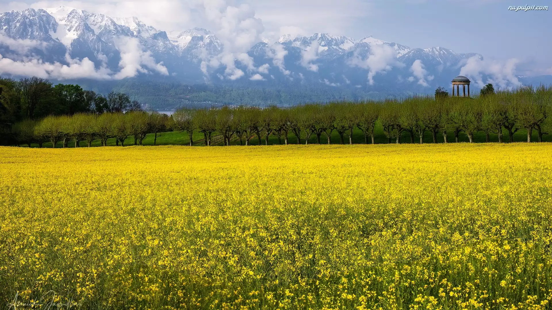 Chmury, Drzewa, Las, Pole, Rzepak, Góry, Mgła Na Pulpit