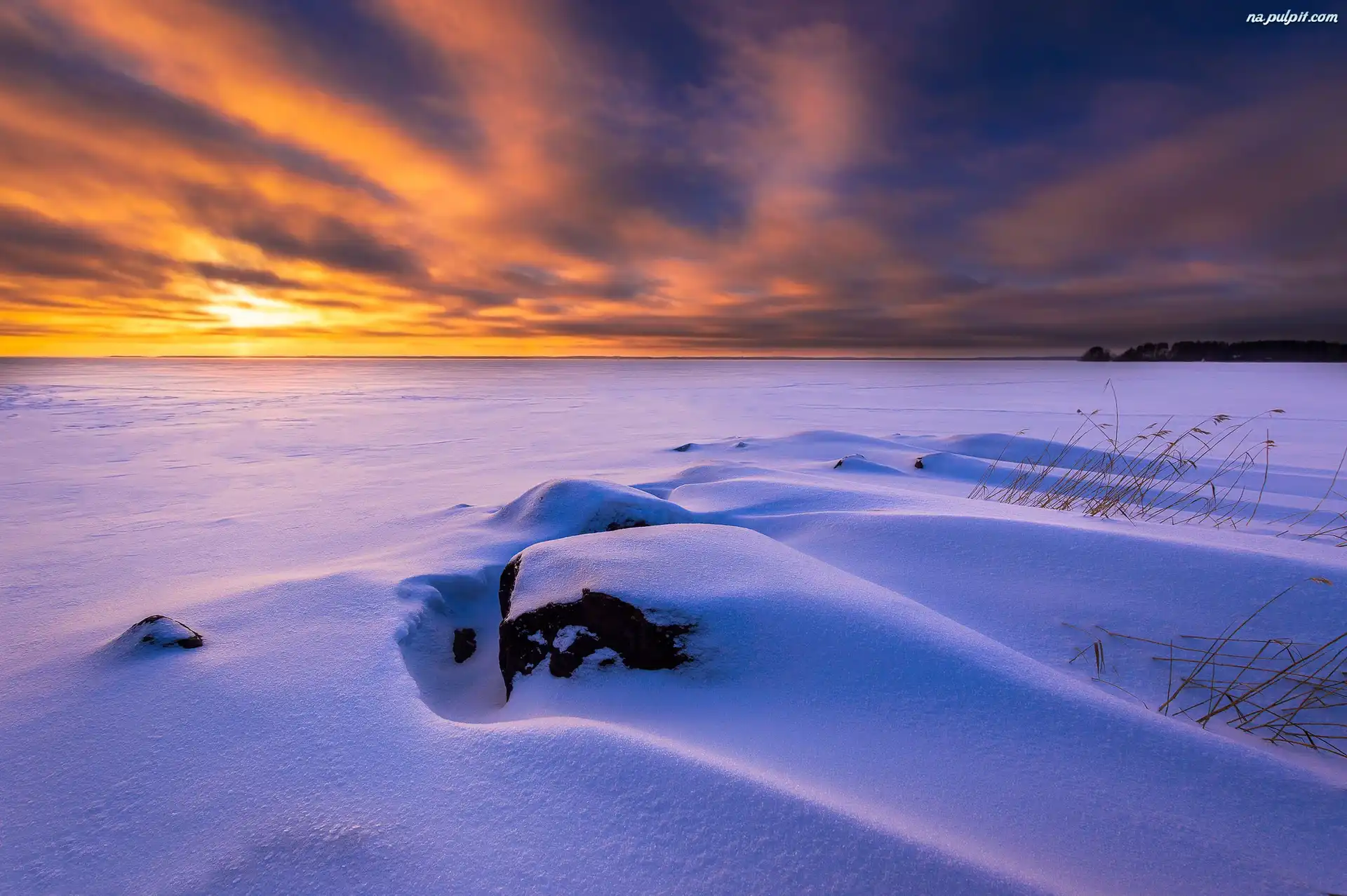 Śnieg, Północna Karelia, Joensuu, Kamienie, Zachód słońca, Jezioro, Finlandia, Zima Na Pulpit