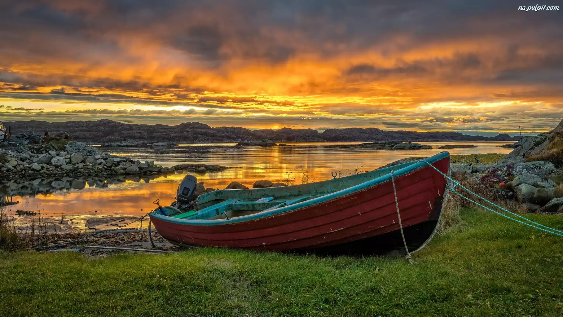 Okręg Rogaland, Łódka, Kamienie, Zachód słońca, Norwegia, Morze Północne Na Pulpit