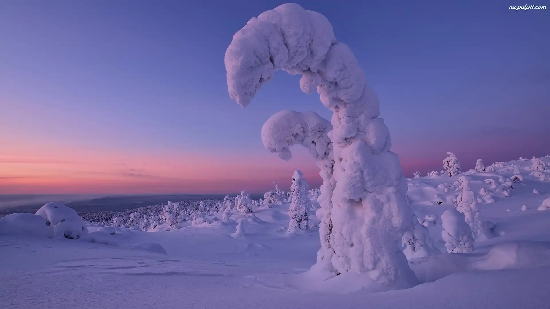 Drzewa, Półwysep Kolski, Rosja, Pochylone, Zima, Ośnieżone