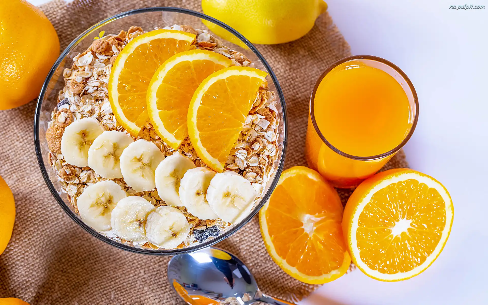 Łyżka, Musli, Owoce, Szklanka, Sok, Banany, Miska, Pomarańcze