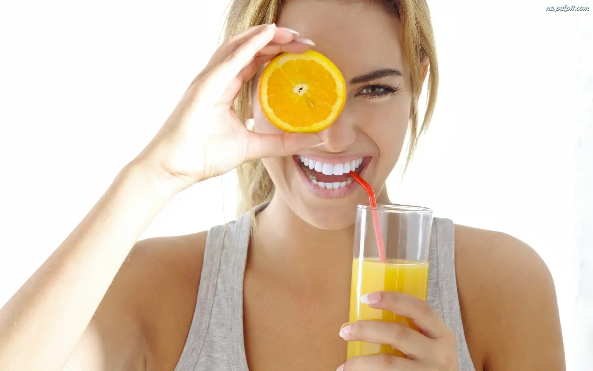 Pomarańczowy, Uśmiechnięta, Blondynka, Sok Na Pulpit