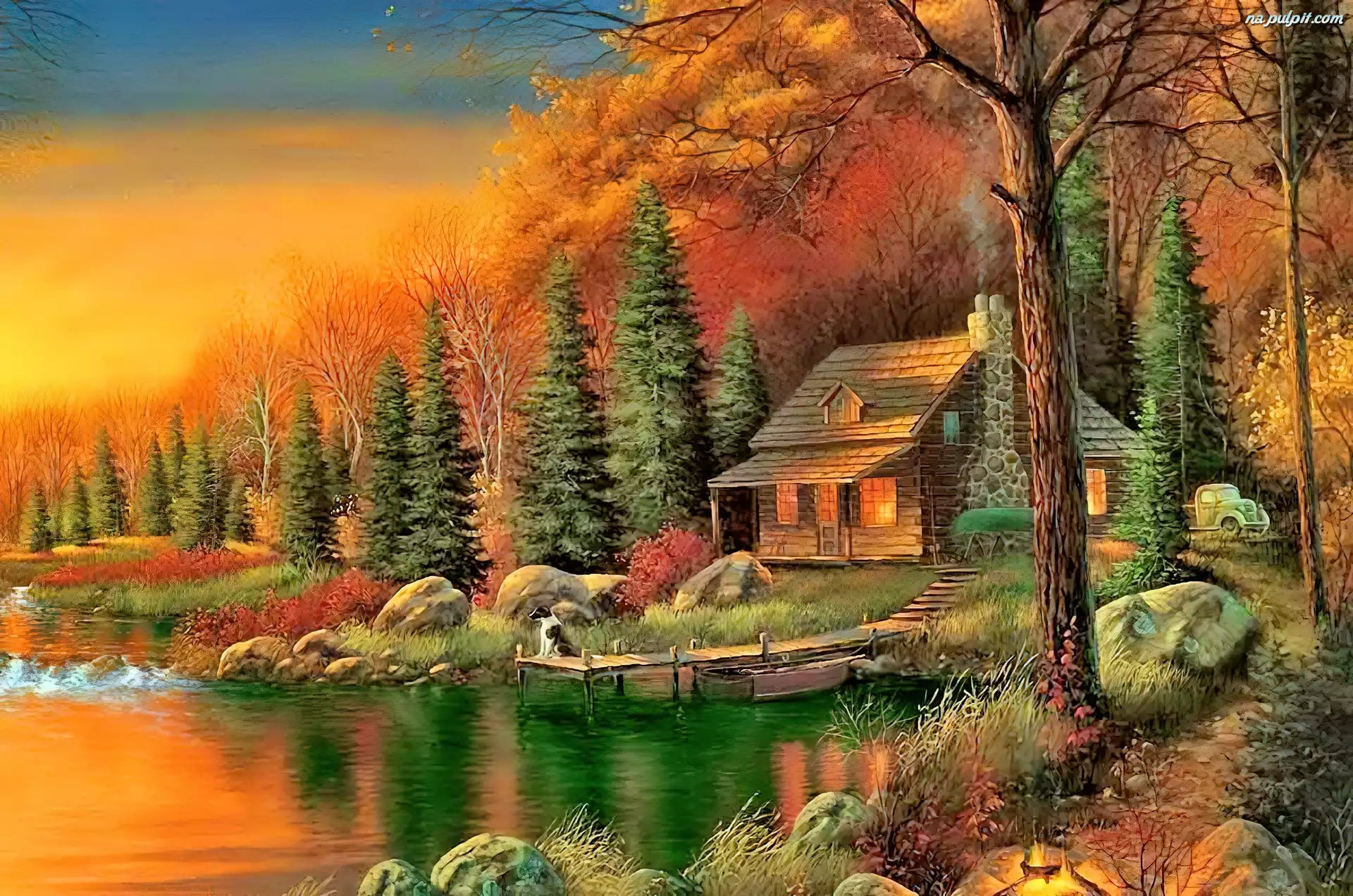 Japonia, Dom Jezioro, Wiosna, Trzciny Donald Zolan, Żonkile, Dziewczynka, Reprodukcja Zima, Jezioro, Góry, śnieg Chmurki, Jezioro, Góry Las, Zielona, Polana Rzeczka, Domki, Czerwone, Wąska Taniec, Kot, Osioł Śnieg, Misie, Dwa, Choinka Dziewczynka, Baletnica Jezioro, Góry motorówka, Jezioro Kobiety, Wojciech Siudmak, Portret Kanapa, Telewizor, Pokój, Dom, Meble