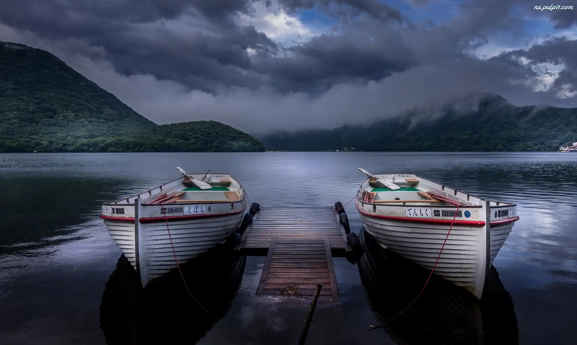 Pomost, Ciemne, Niebo, Jezioro Lake Haruna, Takasaki, Prefektura Gunma, Japonia, Zmierzch, Łódki, Chmury Na Pulpit |