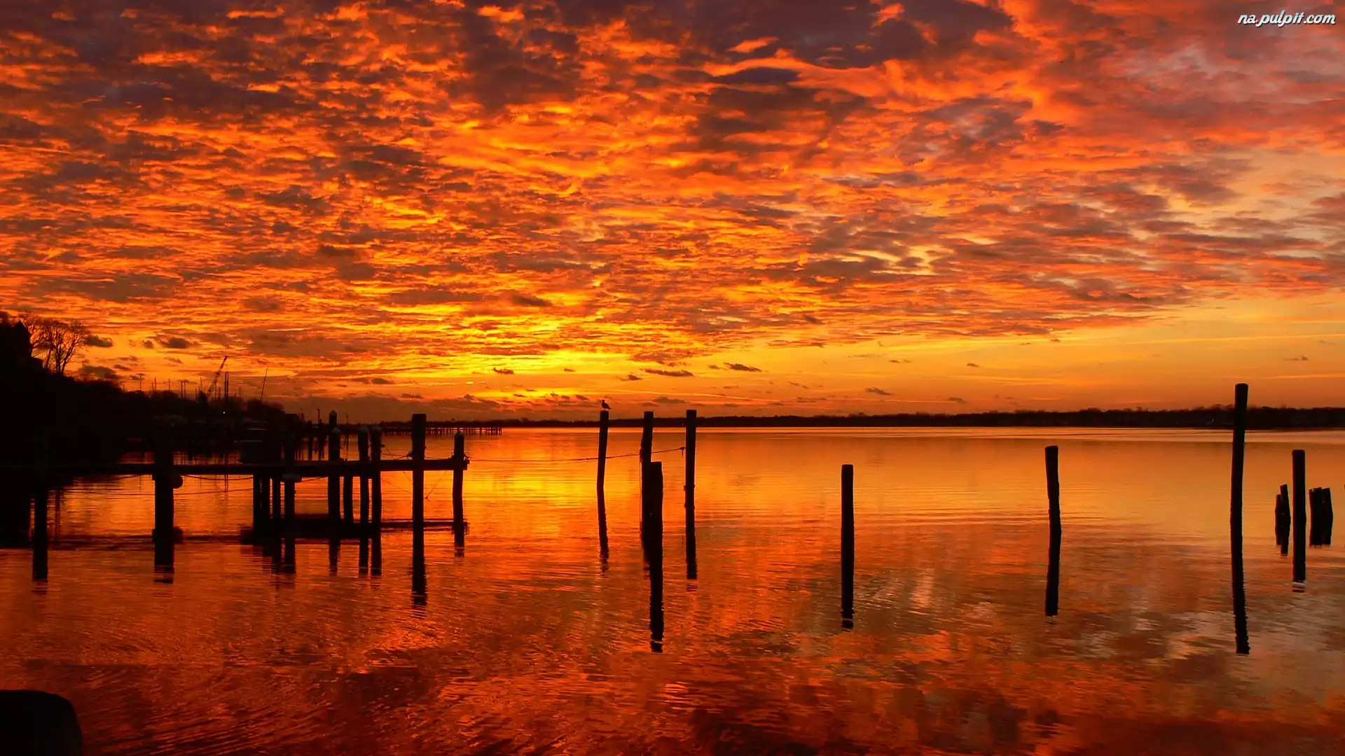 Pomost, Słońca, Zachód, Jezioro, Chmury