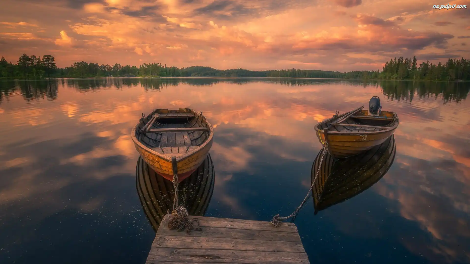 Ringerike, Pomost, Zachód Słońca, Łódki, Norwegia, Jezioro Na Pulpit