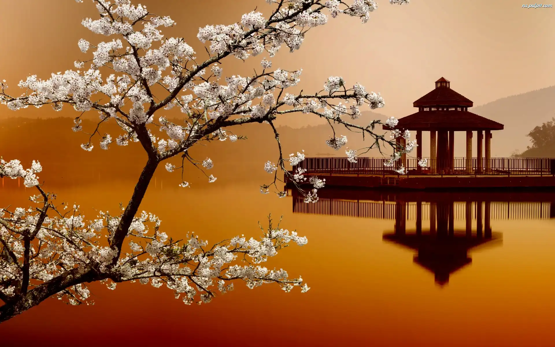Pomost, Drzewo, Japonia, Góry, Rzeka, Kwitnące