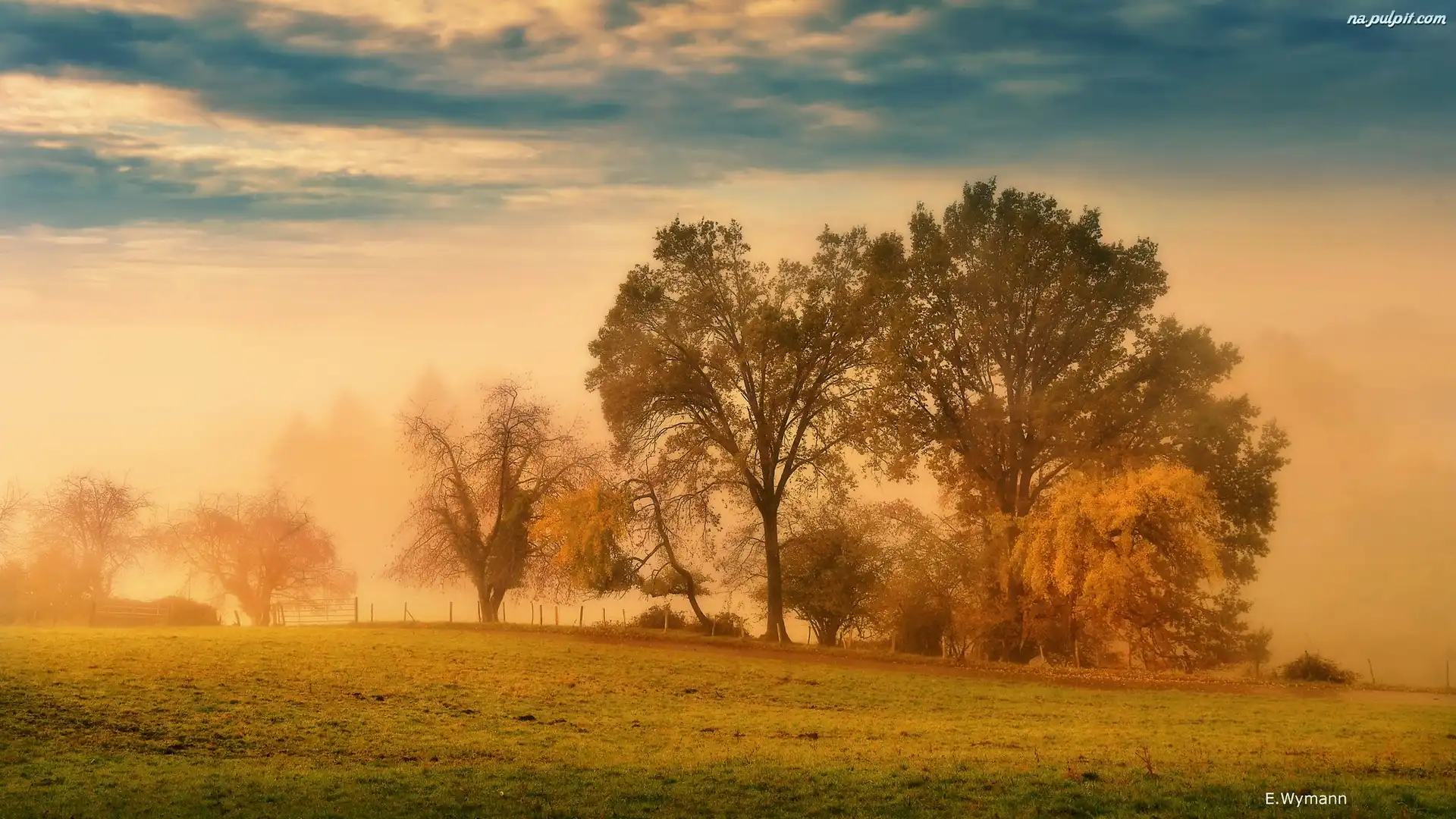 Mgła, Wschód słońca, Poranek, Łąka, Drzewa Na Pulpit