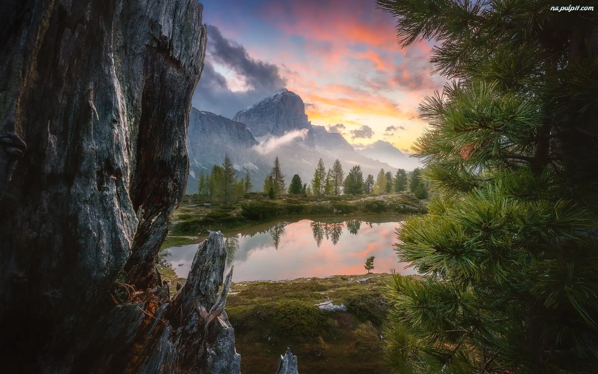 Wschód słońce, Mgła, Kamienie, Góry, Drzewa, Staw, Poranek Na Pulpit