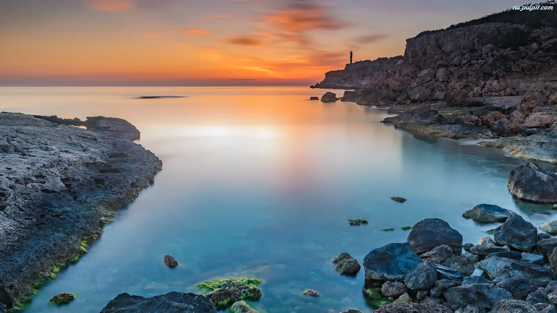 Portinatx, Skały, Latarnia morska, Ibiza, Hiszpania, Punta des Moscarter, Morze Śródziemne, Wschód słońca Na Pulpit |