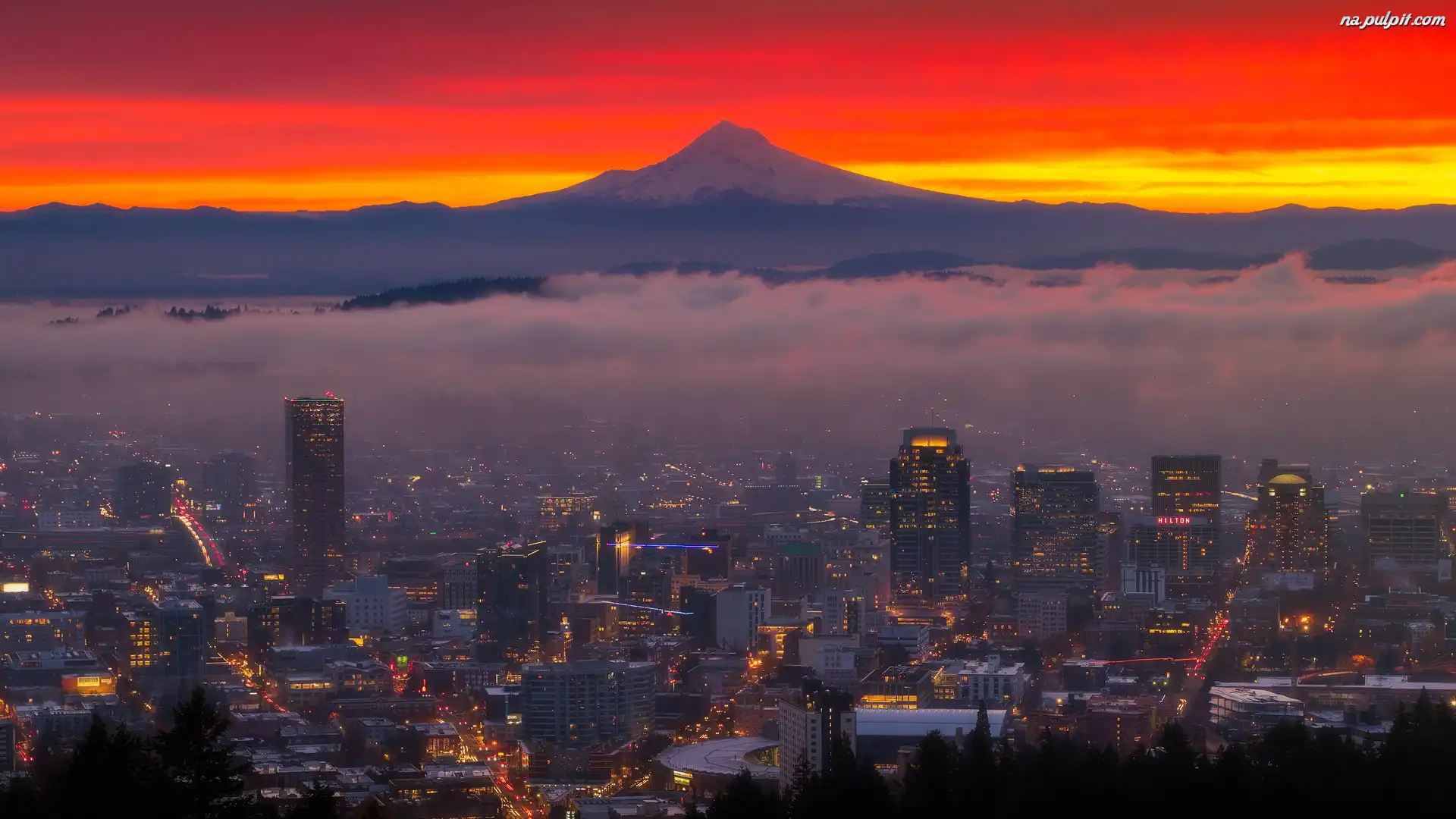 Portland, Góra, Stratowulkan, Mount Hood, Stan Oregon, Stany Zjednoczone, Oświetlone, Wschód słońca, Miasto Na Pulpit |