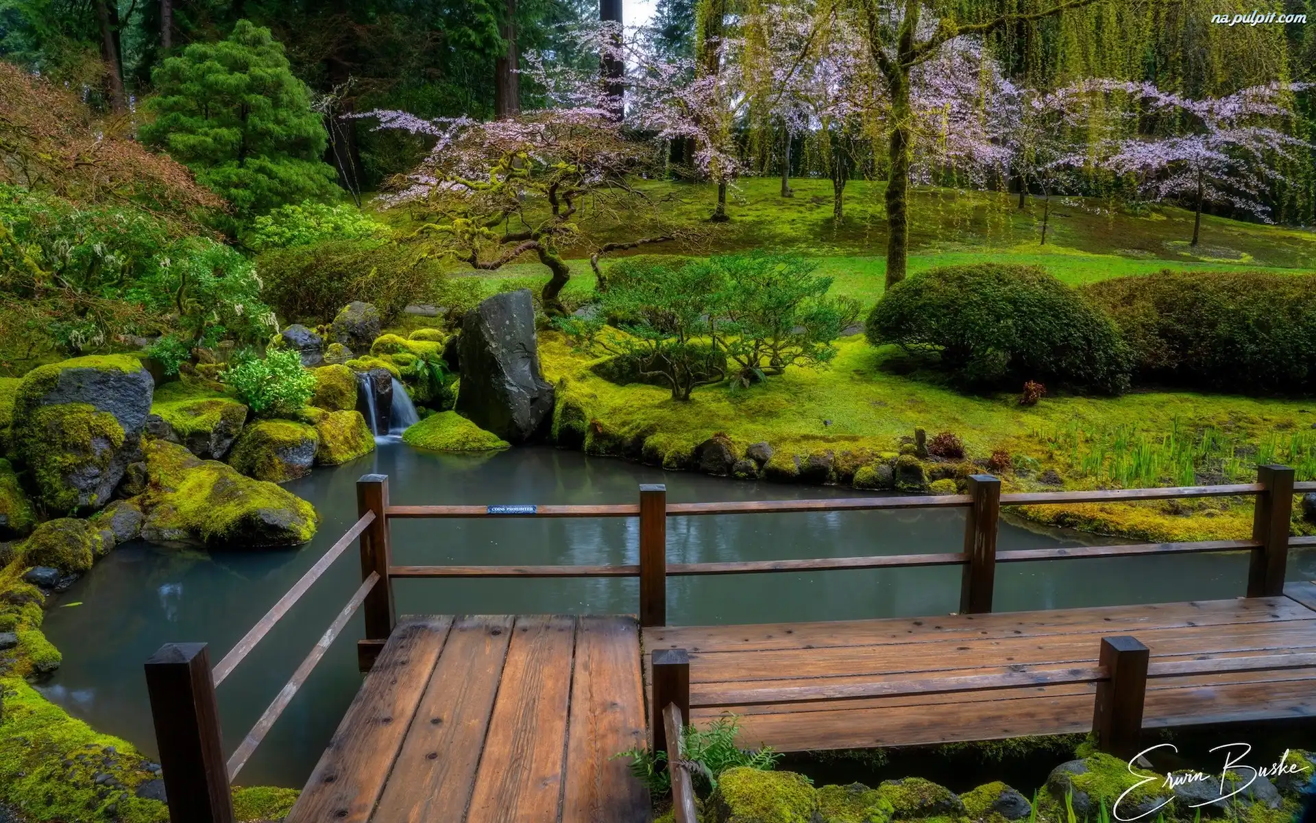 Sadzawka, Pomost, Oregon, Ogród japoński, Kwitnące, Portland, Stany Zjednoczone, Roślinność, Drzewa Na Pulpit |