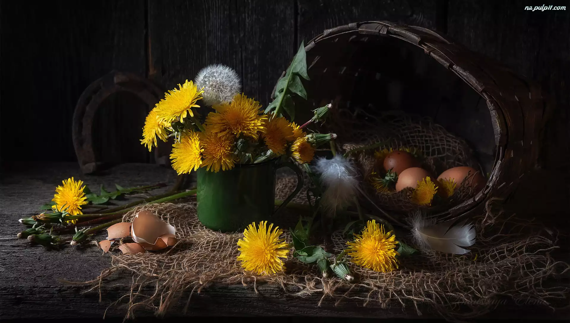 Koszyczek, Kompozycja, Mniszki pospolite, Jajka, Kwiaty, Skorupki