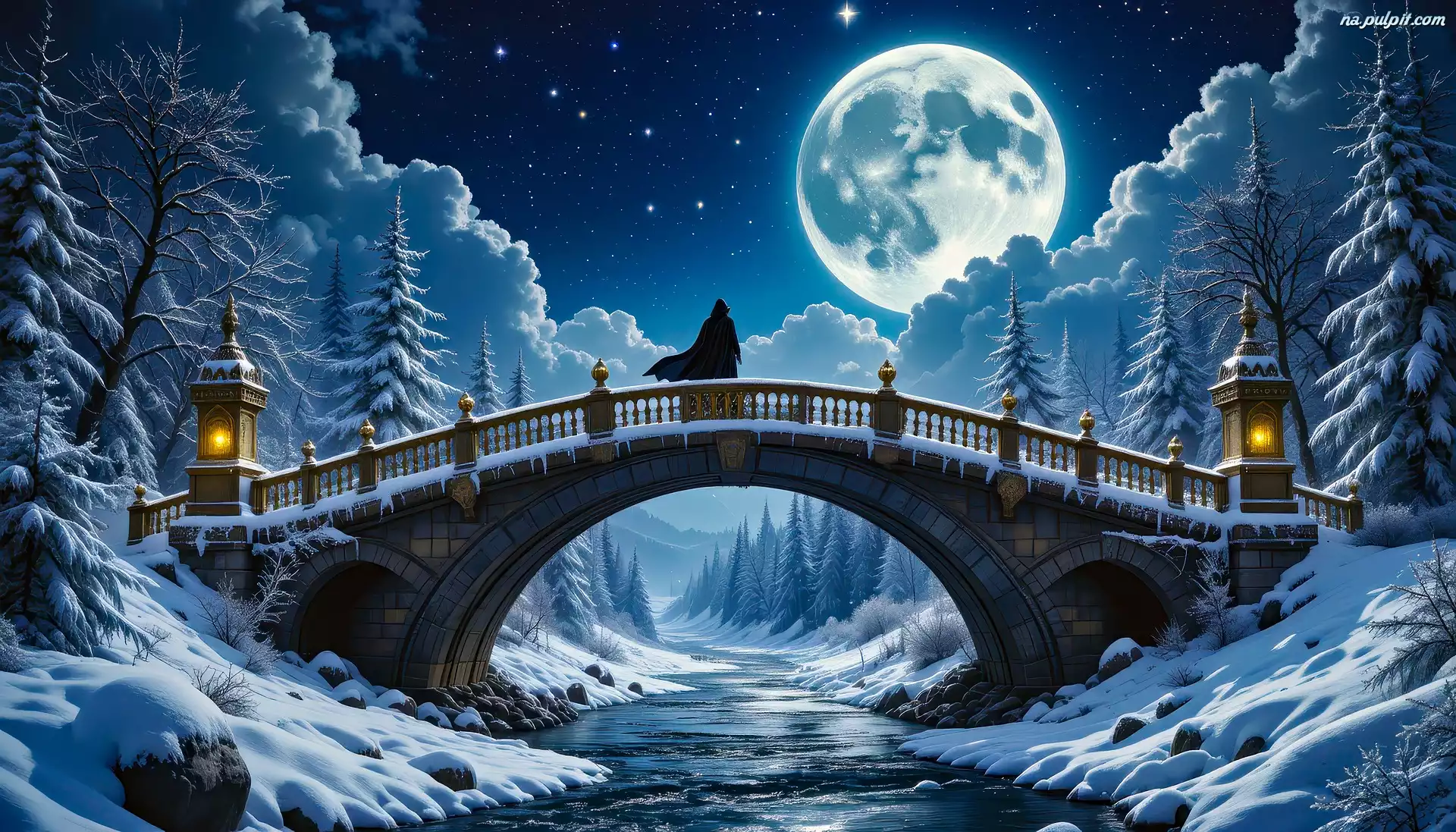 Noc, Most, Księżyc, Zima, Grafika, Drzewa, Rzeka, Postać Na Pulpit