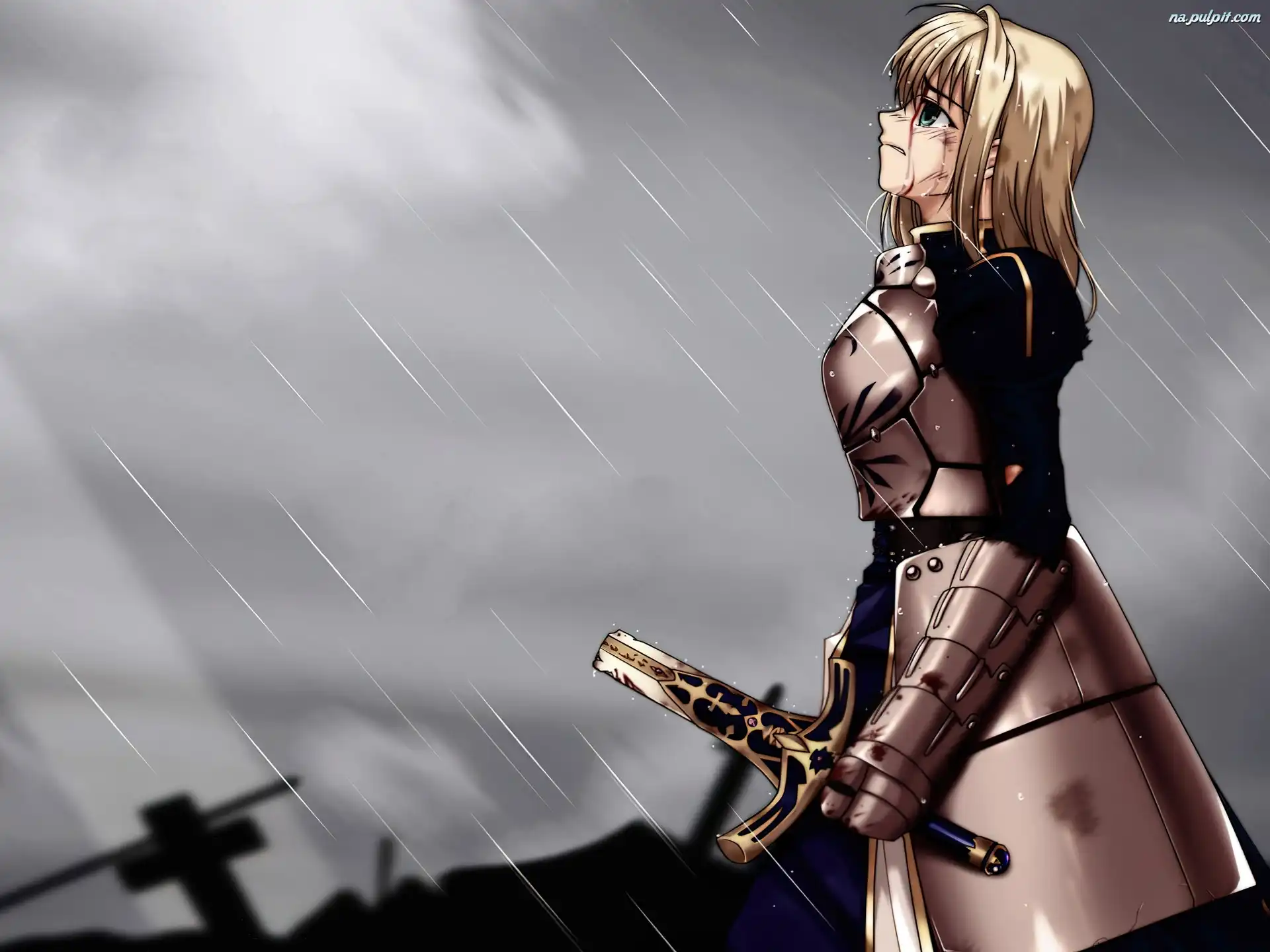 postać, deszcz, Fate Stay Night, zbroja Na Pulpit