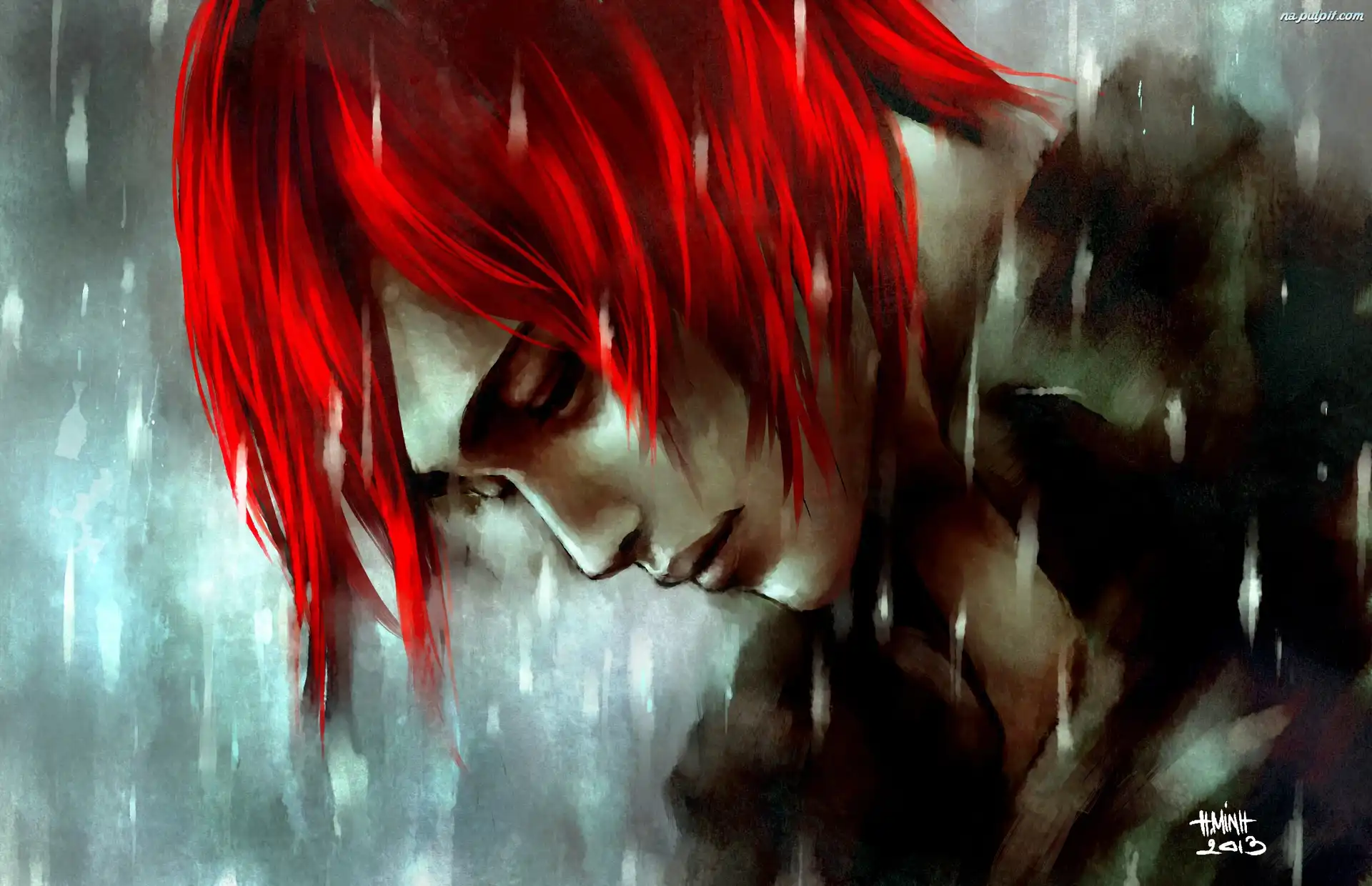 Postać, Deszcz, Obraz, Czerwone, Smutna, Włosy