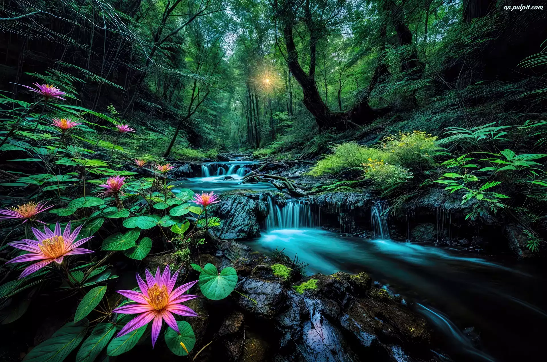 Promienie słońca, Kwiaty, Potok, Grafika, Las Na Pulpit