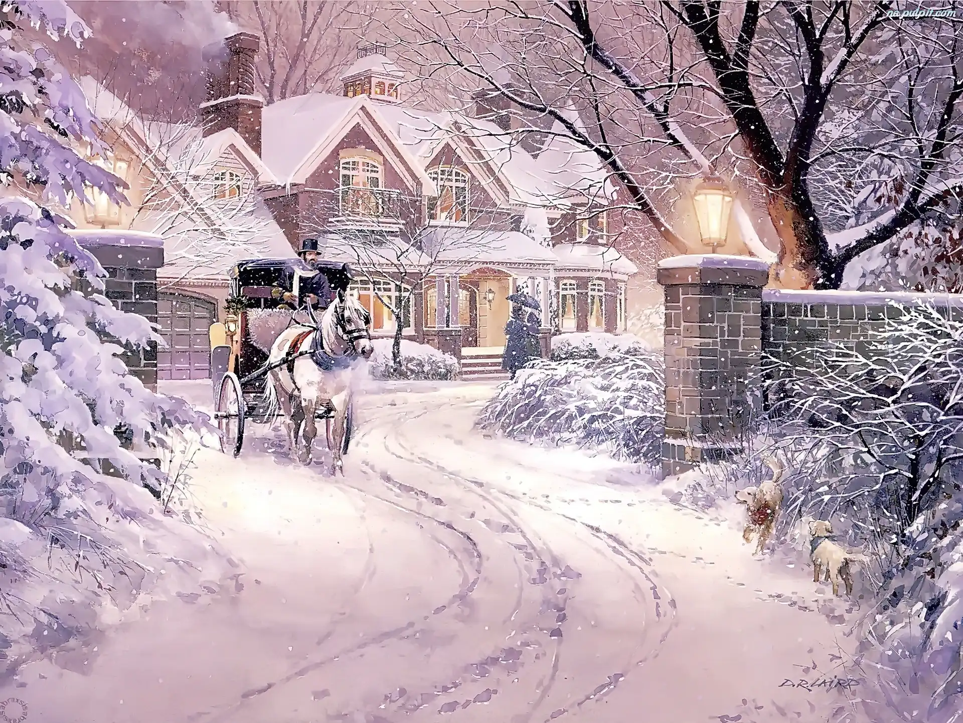 Powóz, Zima, Widoczek, Zimowy, Dom