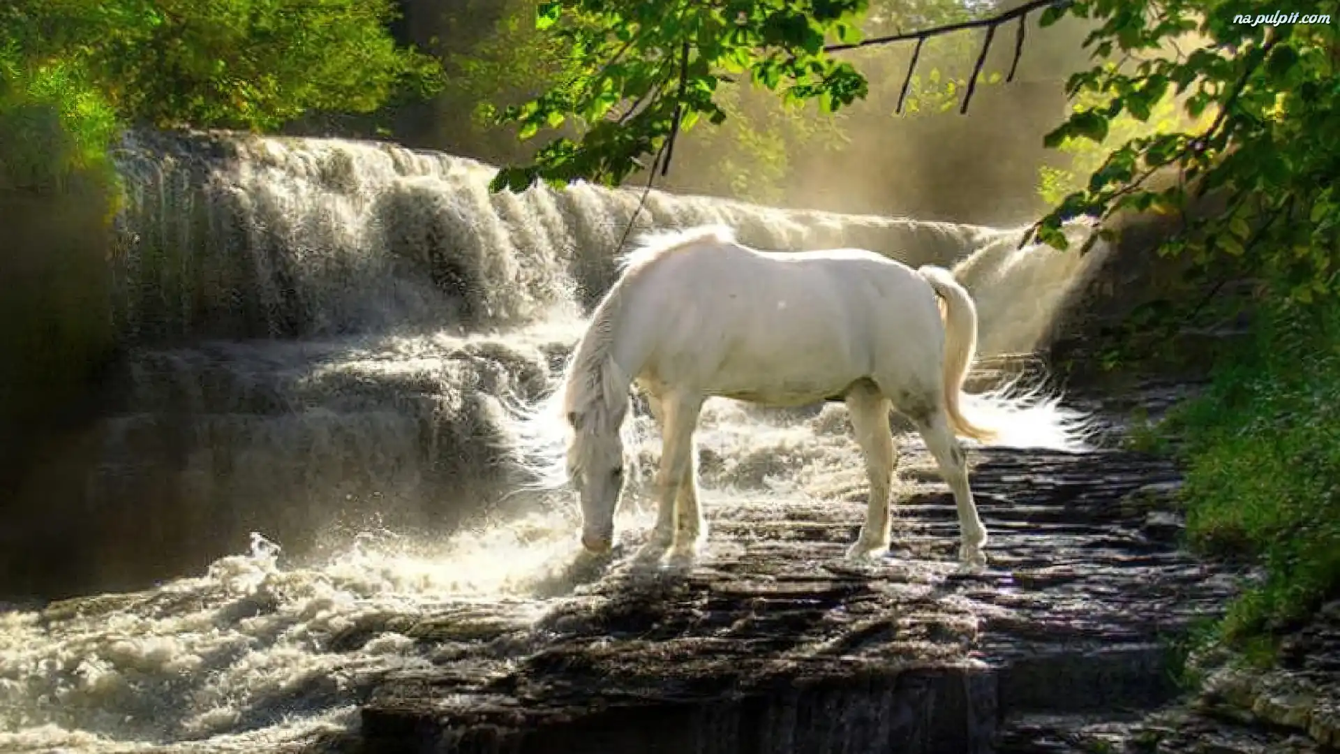 Pragnienie, Wodospad, Biały, Koń, Las Na Pulpit