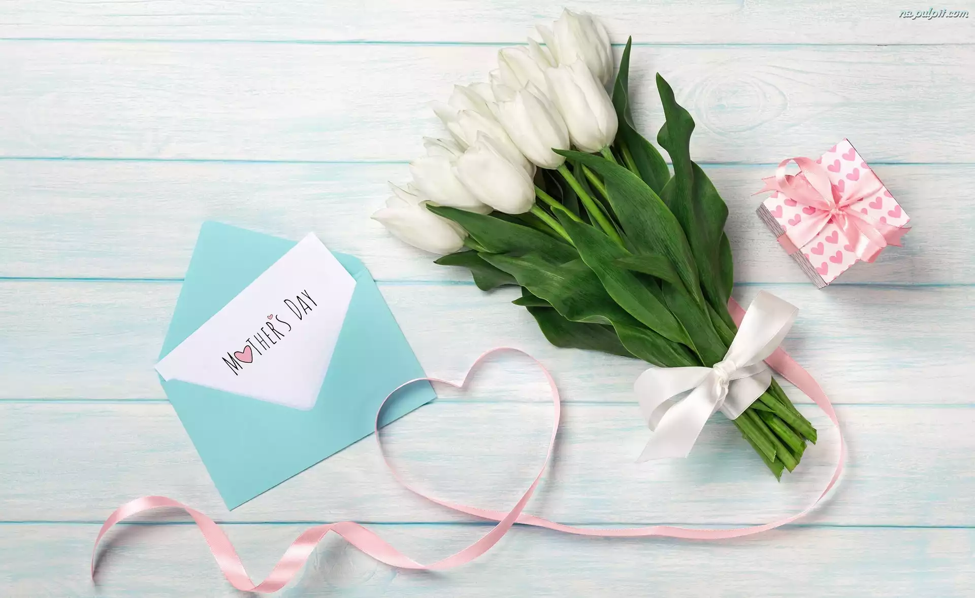 Kwiaty, Koperta, Prezent, Tulipany, Napis, Dzień Matki, Wstążki, Niebieska, Białe, Kartka Na Pulpit |