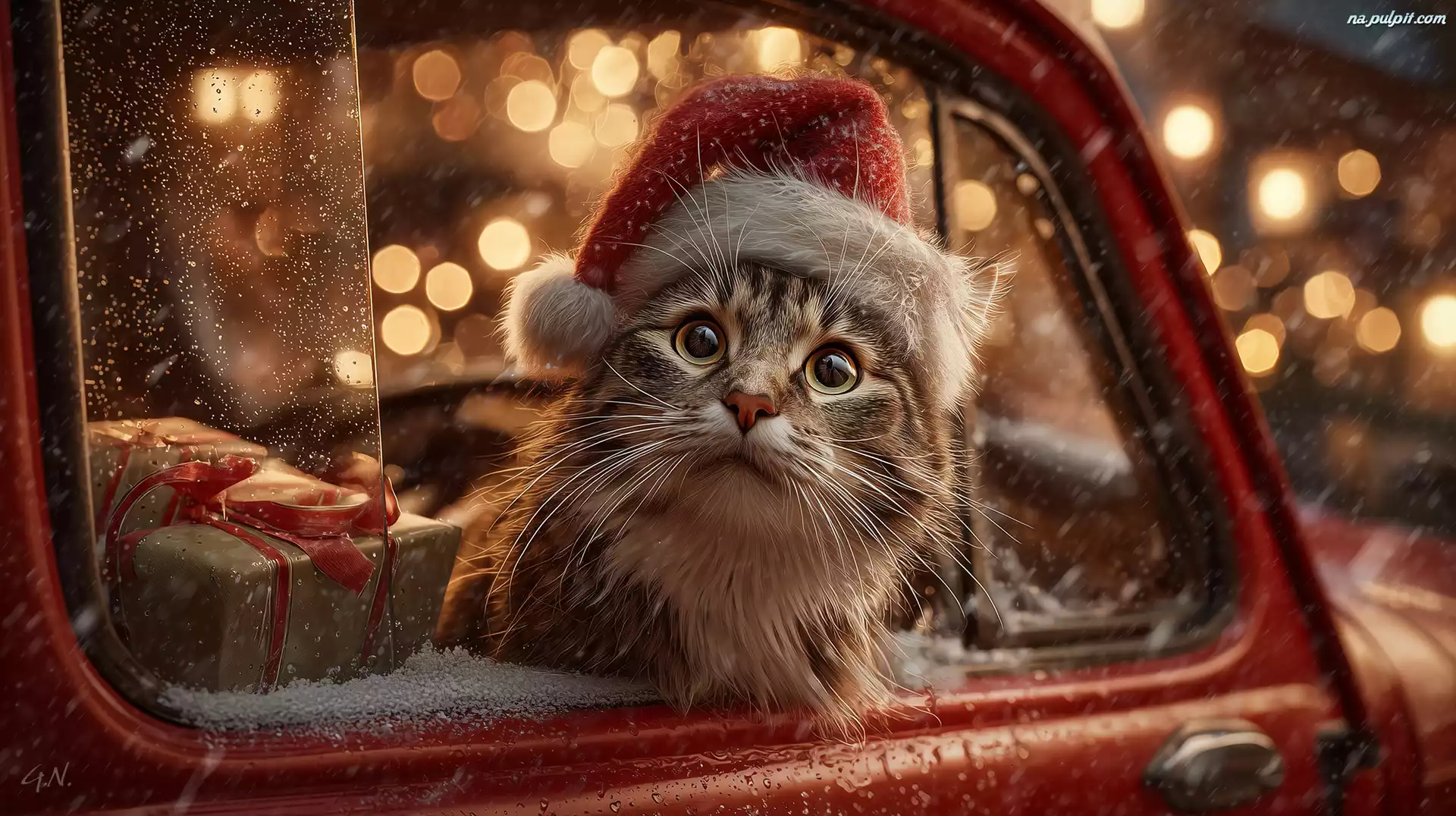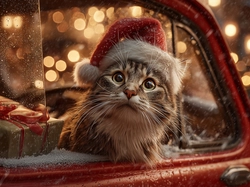 Grafika AI, Okno, Samochód, Kot, Czapla, Mikołaja, Prezent Na Pulpit