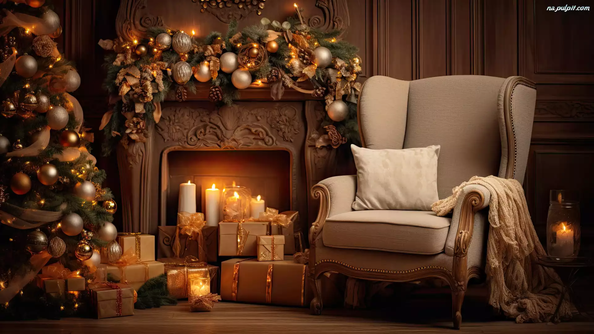 Boże Narodzenie, Choinka, Świece, Pokój, Fotel, Kominek, Prezenty