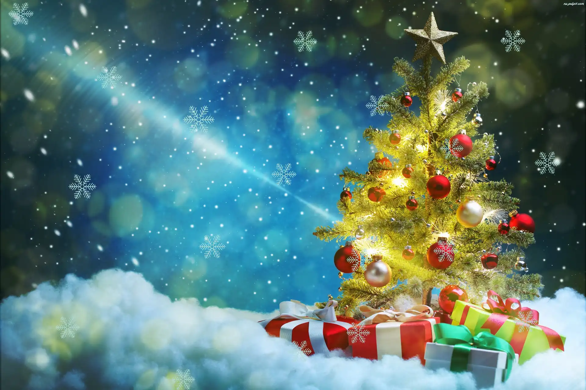 Prezenty, Gwiazdki, Åšniegu, Bombki, Choinka , Åšnieg