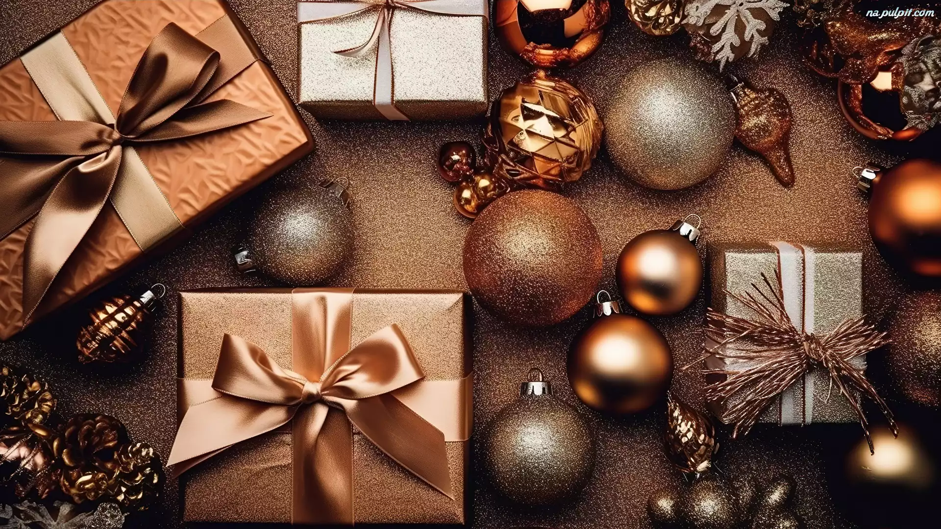 Złote, Boże Narodzenie, Prezenty, Kokardki, Pudełka, Bombki