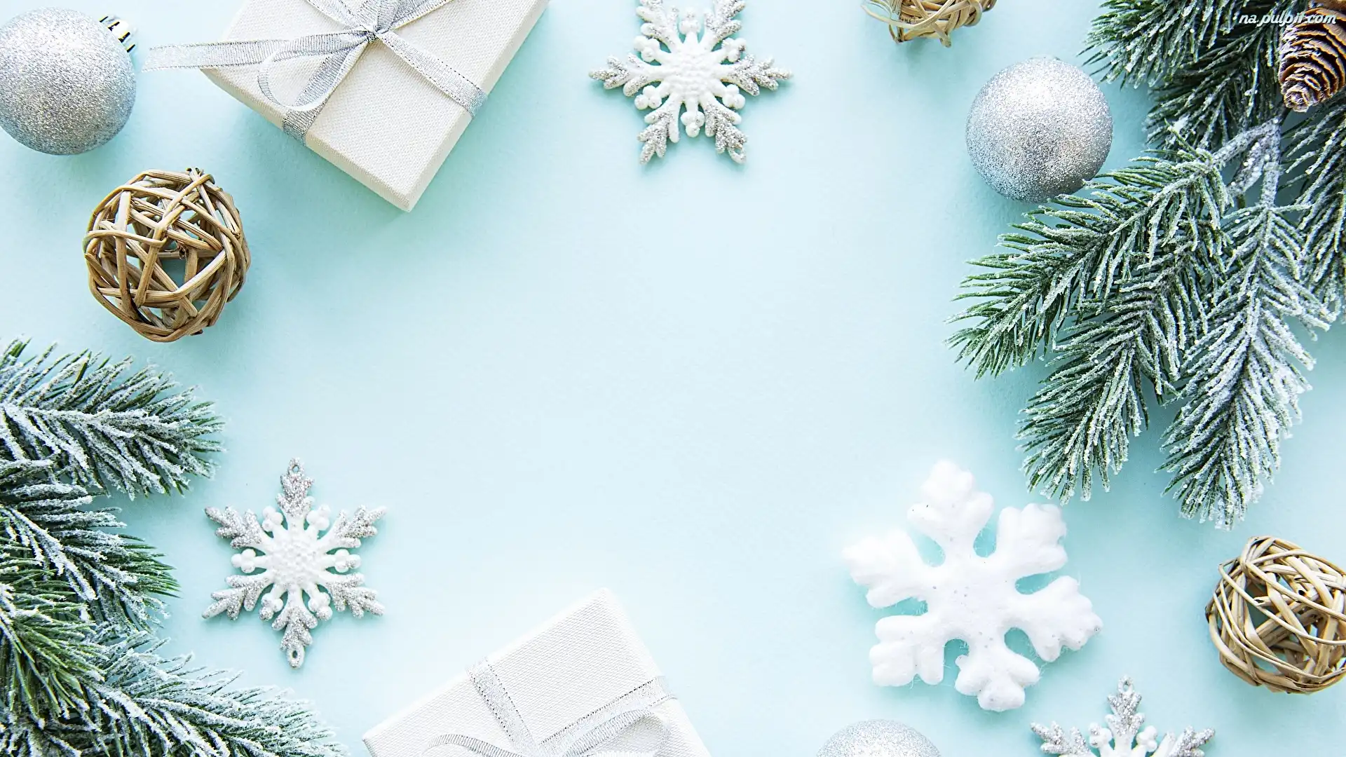Tło, Prezenty, Niebieskie, Bombki, Gałązki, Świąteczne, Śnieżynki Na Pulpit