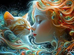 Kot, Rudowłosa, Twarz, Profil, Kobieta, Grafika