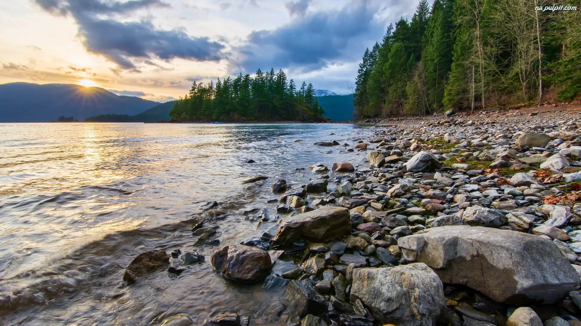 Promienie słońca, Kolumbia Brytyjska, Drzewa, Kamienie, Kanada, Park prowincjonalny Sasquatch, Jezioro Harrison Lake Na Pulpit |