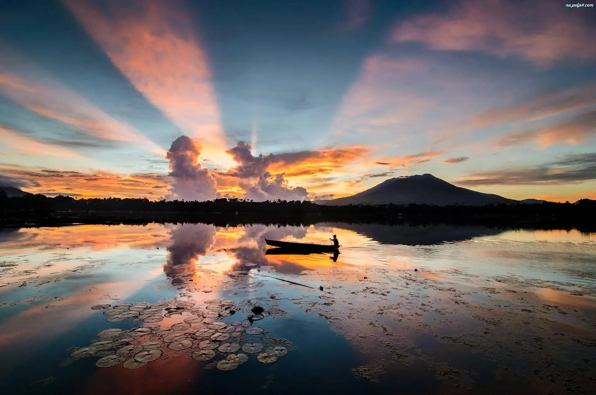 Łódka, Chmury, Słońca, Promienie, Morze Na Pulpit