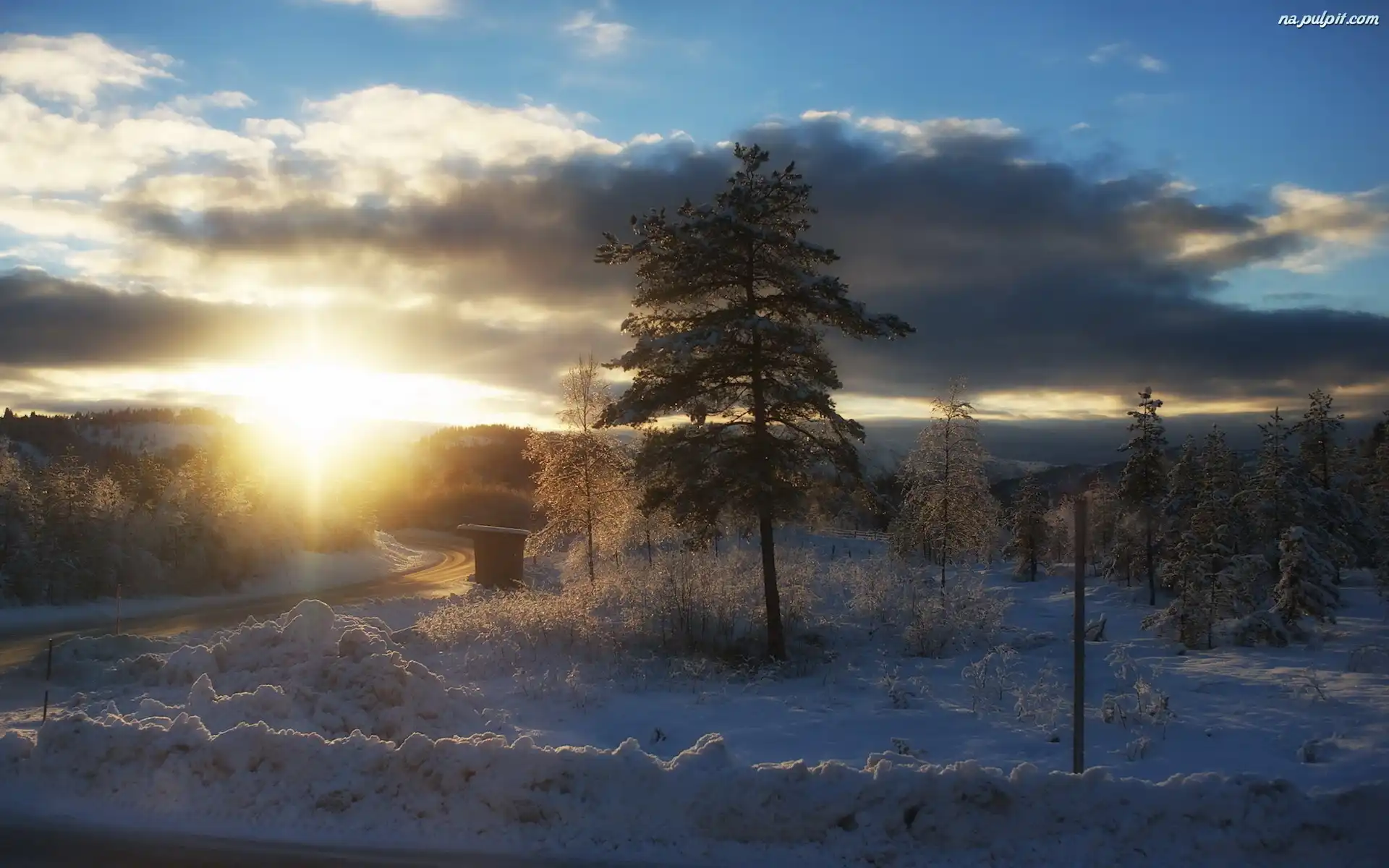 Promienie słońca, Chmury, Droga, Śnieg Na Pulpit