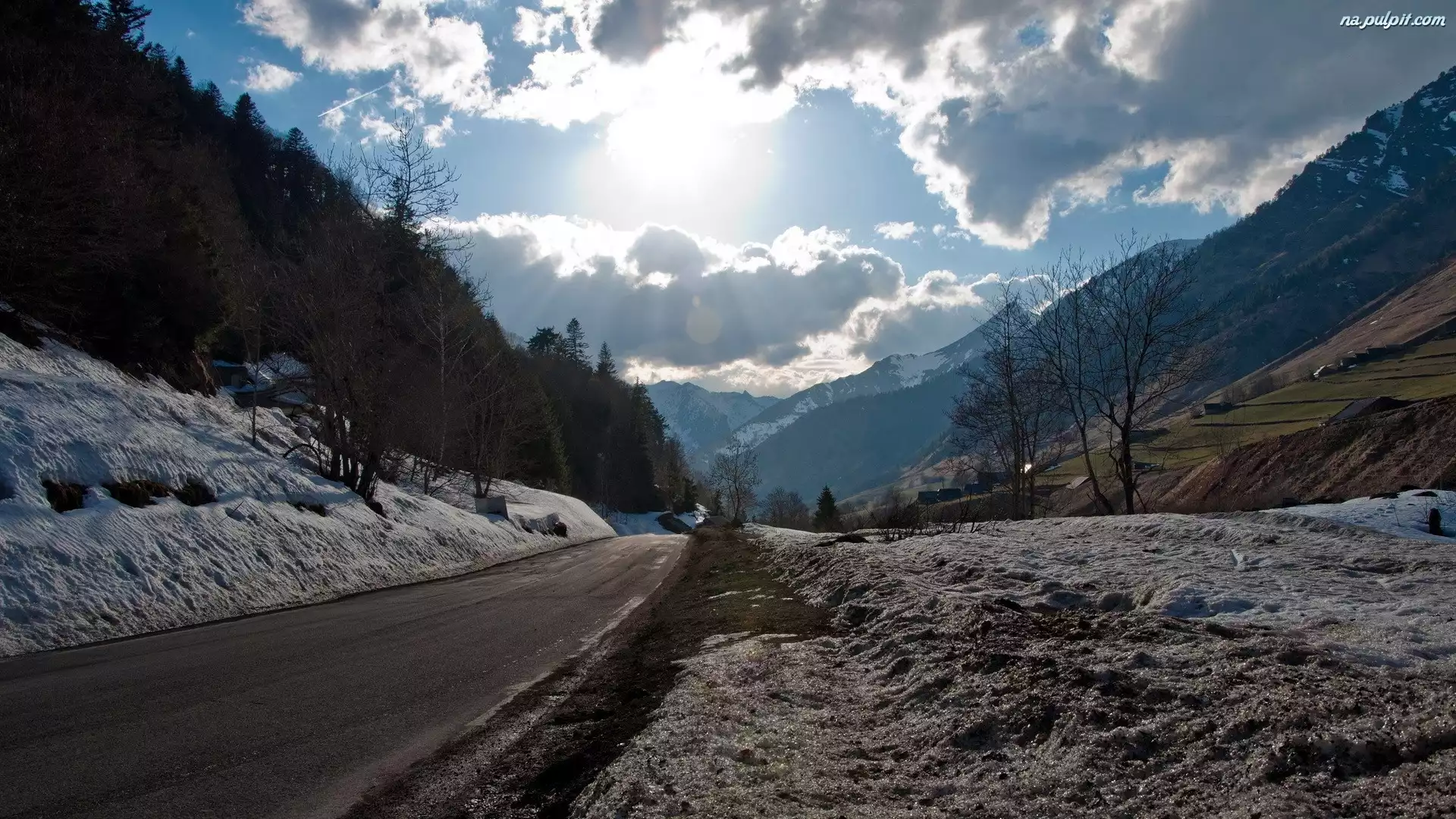 Promienie słońca, Śnieg, Droga, Góry Na Pulpit