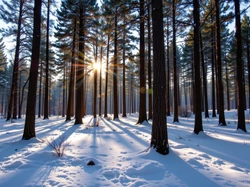 Śnieg, Las, Sosnowy, Promienie słońca, Drzewa