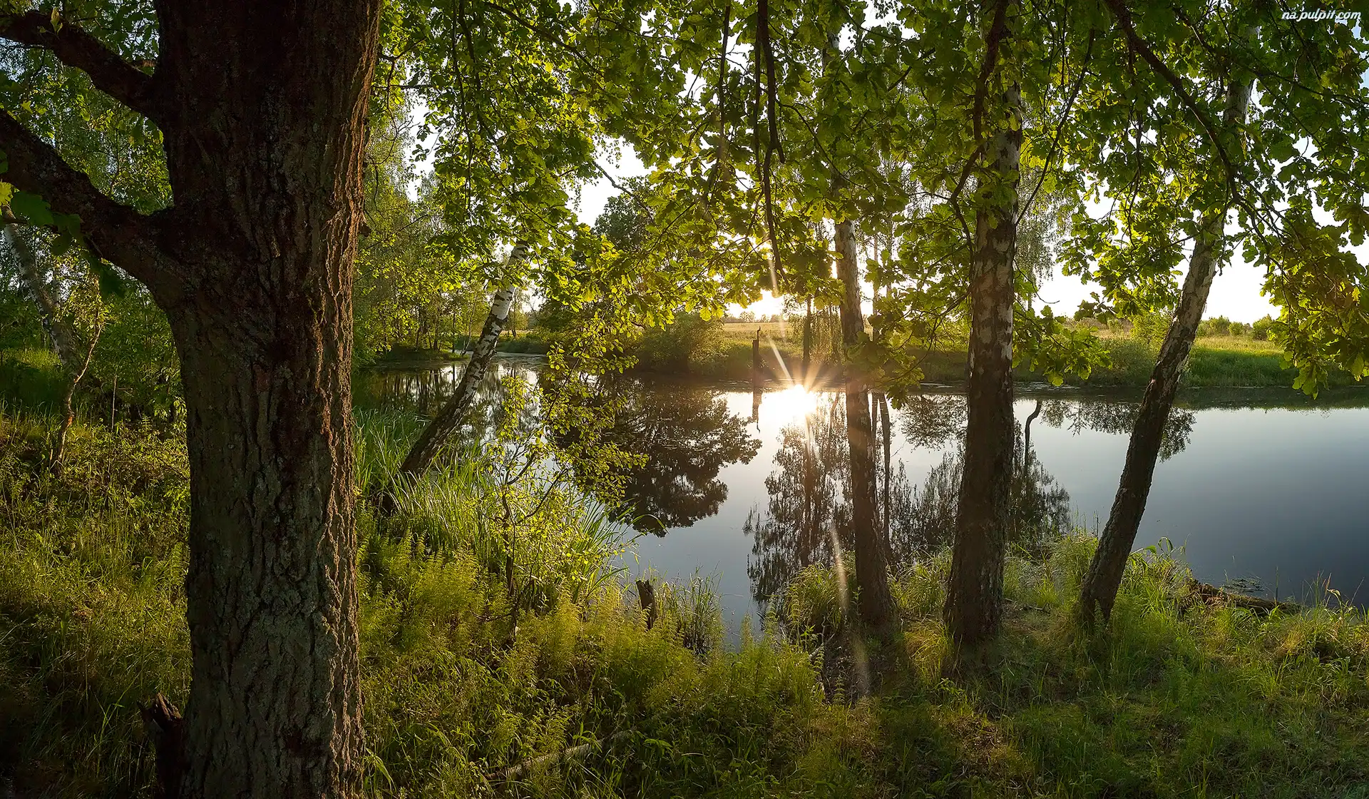 Promienie słońca, Trawa, Drzewa, Rzeka