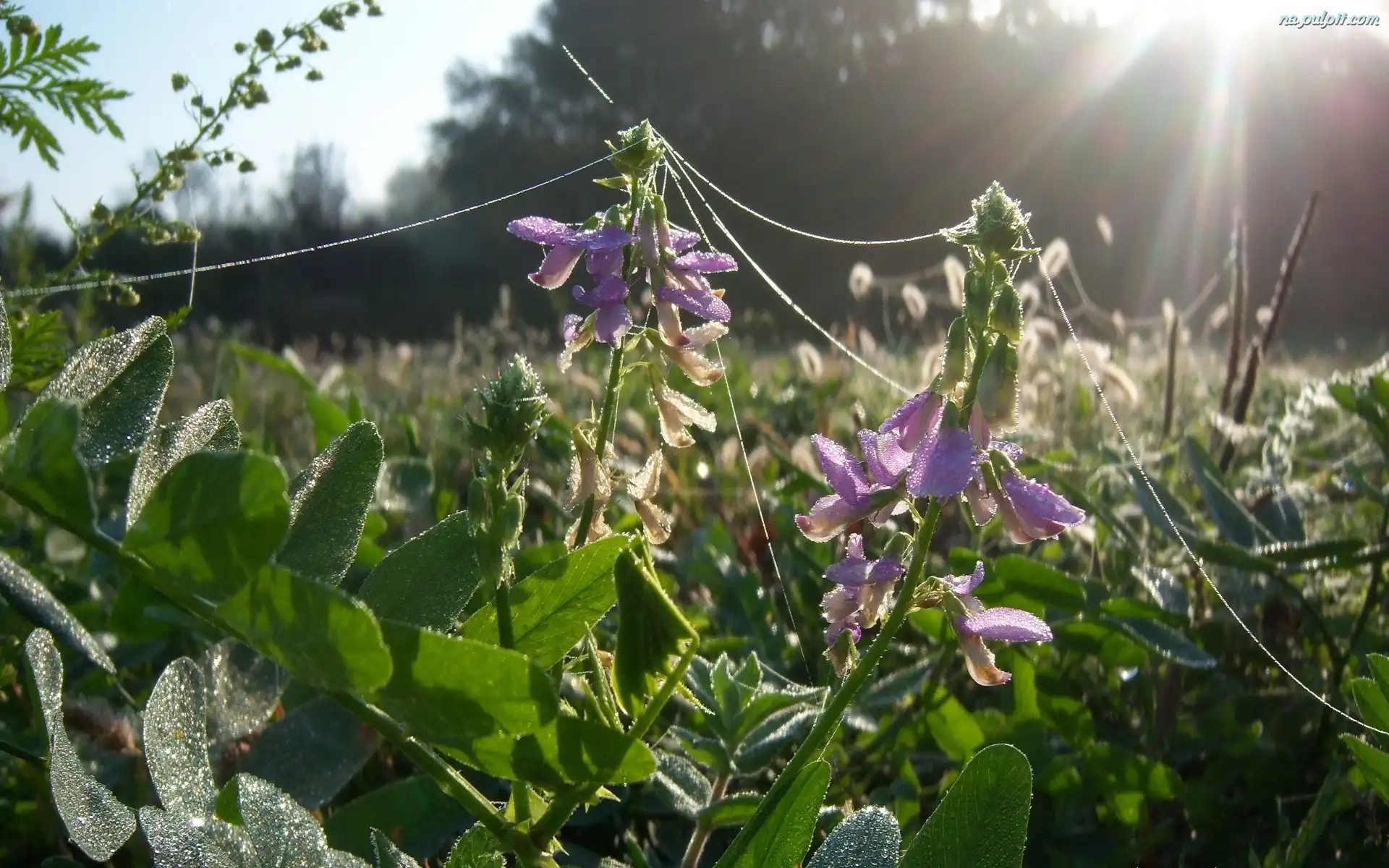 Promienie, Rosa, Kwiaty, Fioletowe, Pajęczyna Na Pulpit