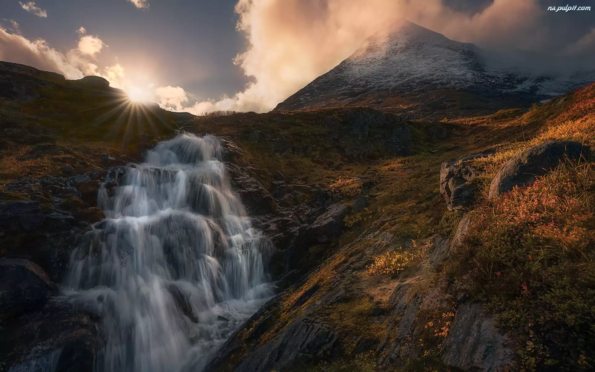 Wodospad, Norwegia, Romsdalen, Promienie słońca, Góry Na Pulpit