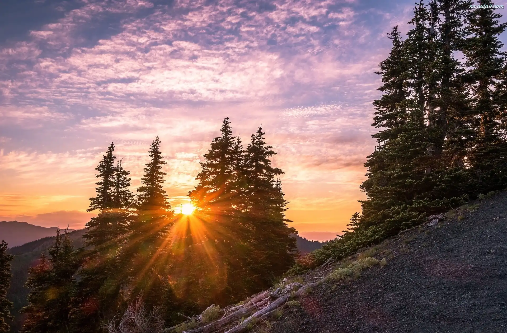 Promienie, Zachód, Świerki, Góry, Słońca Na Pulpit