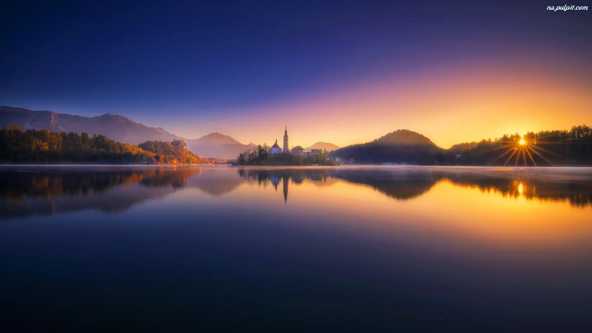 Promienie słońca, Wyspa Blejski Otok, Zachód słońca, Jezioro Bled, Góry Alpy Julijskie, Słowenia, Kościół Zwiastowania Marii Panny Na Pulpit |
