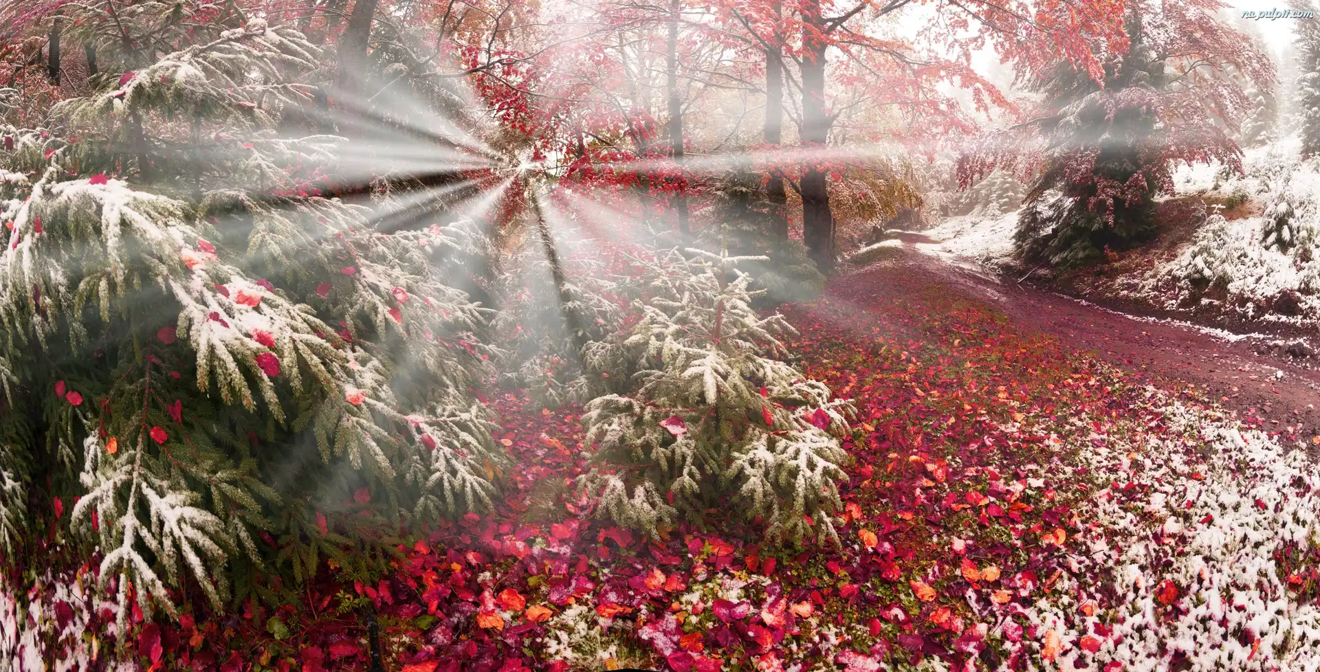 Promienie słońca, Las, Śnieg, Jesień, Drzewa Na Pulpit