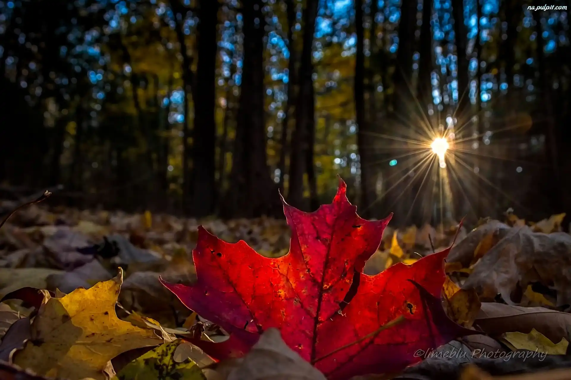 Promienie słońca, Las, Jesień, Liście