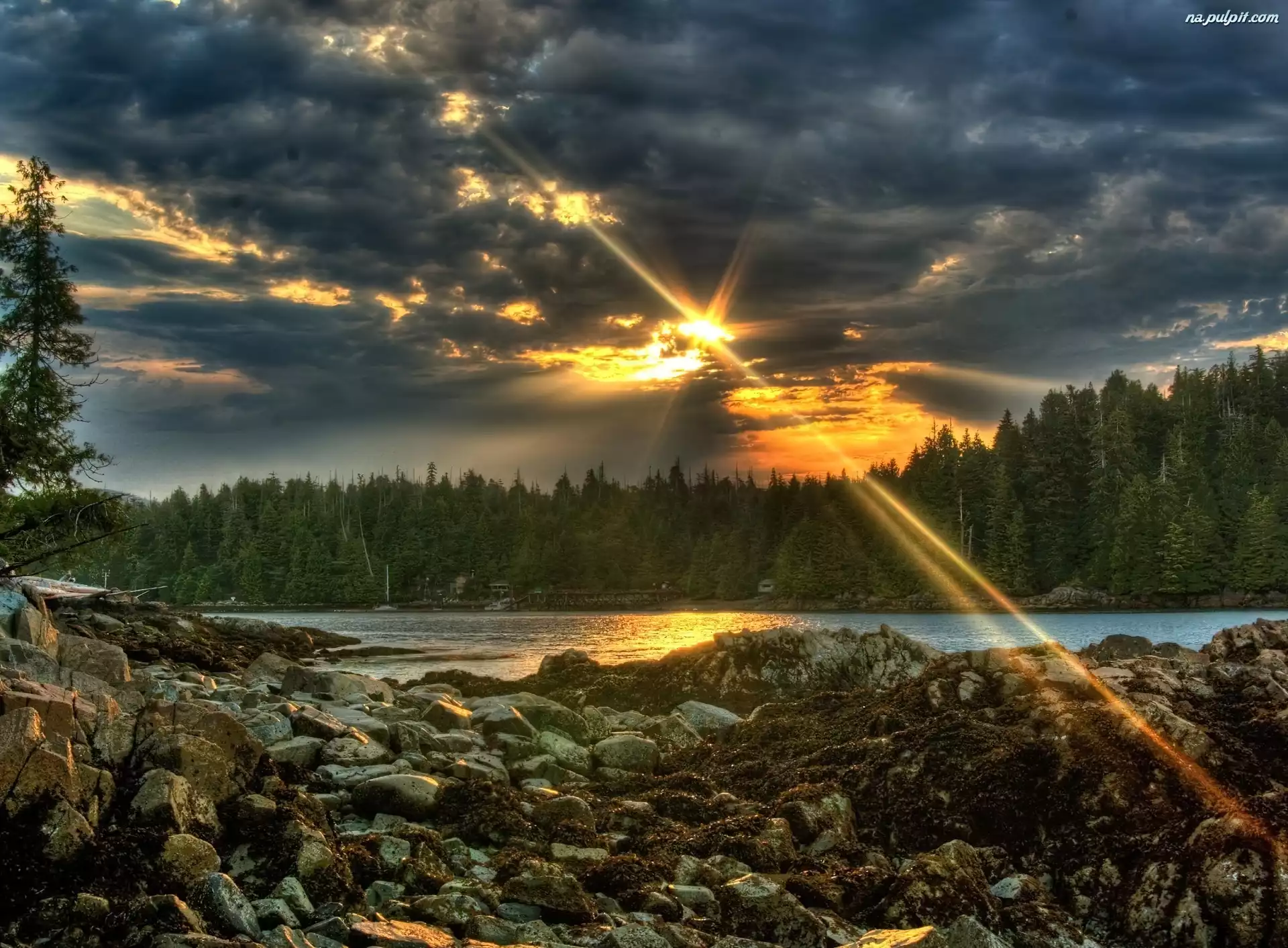 Promienie Słońca, Ciemne, Lasy, Jezioro, Chmury Na Pulpit