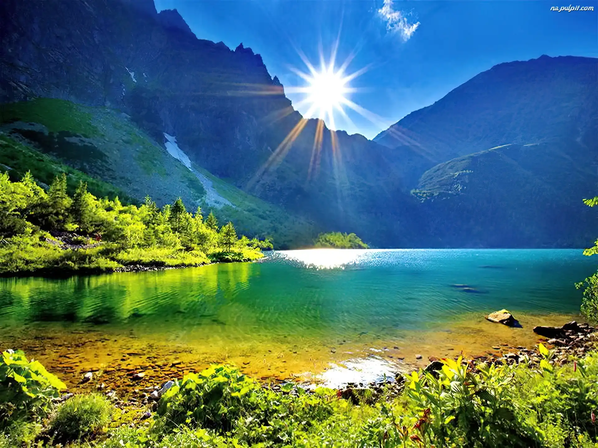 Promienie, Góry, Jezioro, Słońce Na Pulpit